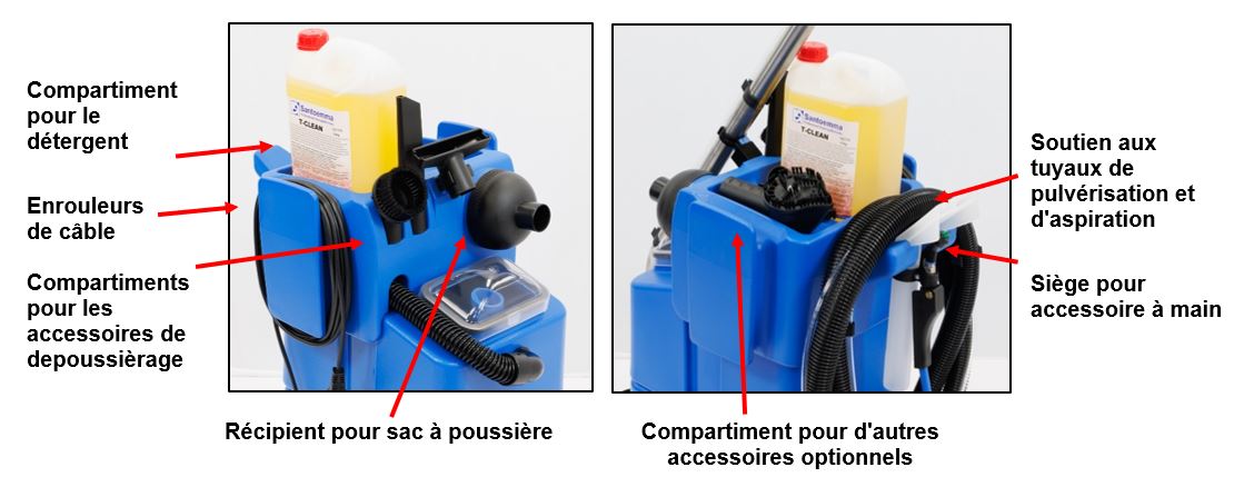 En outre, SMARTVACUUM-15 permet de ranger facilement les accessoires pour aspirer la poussière, le cordon d'alimentation, un bidon de détergent, les tuyaux et le suceur à main pour le lavage par injection-extraction.