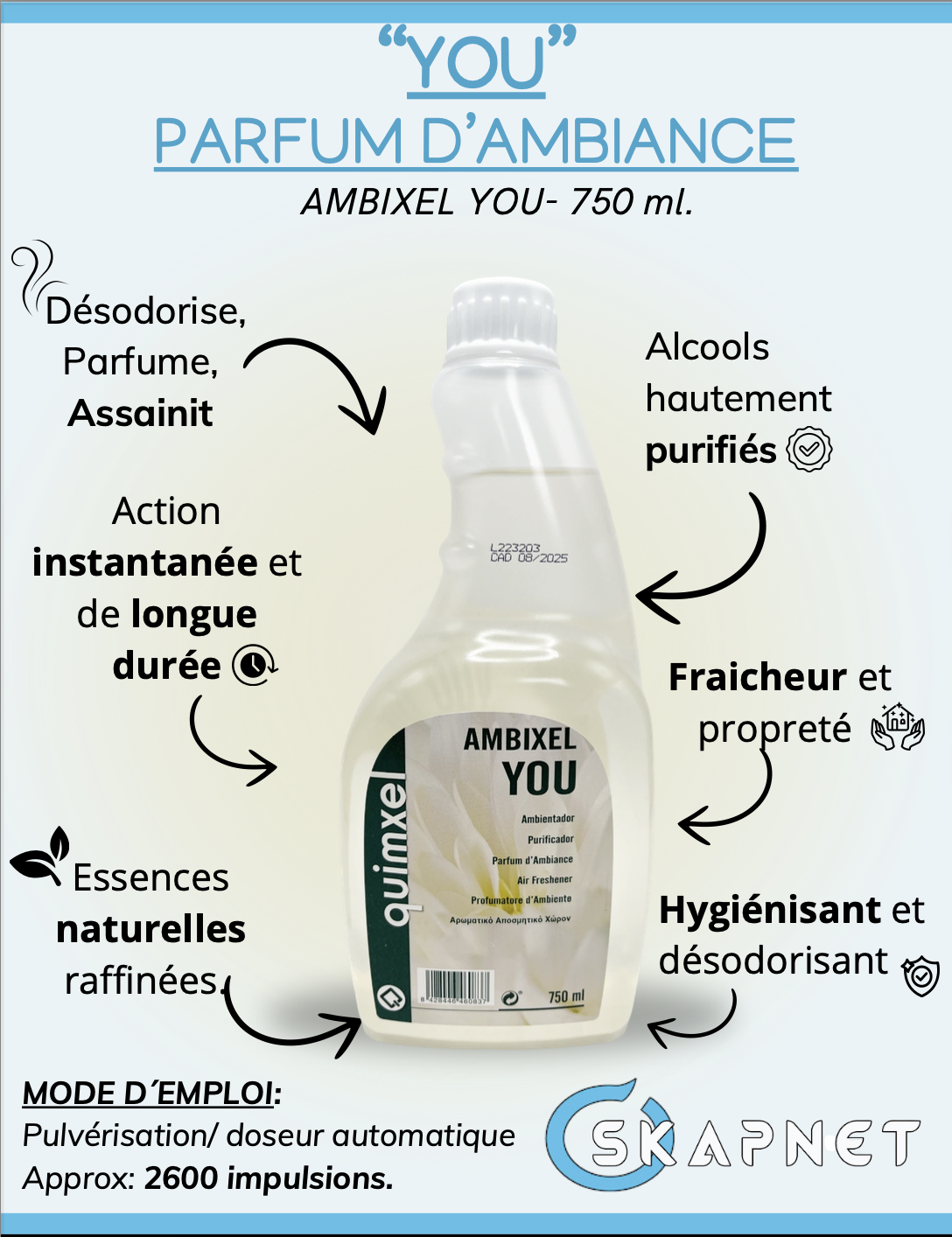 AMBIXEL YOU est un parfum d’ambiance concentré, offrant une action instantanée et de longue durée. Il crée une sensation agréable de fraîcheur et de propreté, tout en désodorisant, parfumant et assainissant efficacement tout type d’environnement.